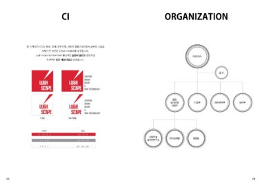 CI ORGANIZATION 루 스케이프의 CI는 방송, 무대, 경관조명, 사운드 전문기업으로서 신뢰와 기술을 바탕으로 새로운 도전과 Creative를 추구합니다. Lugh scape Symbol mark 빨강색은 젊음과 열정을 상징하고 하얀색은 밝은 세상의 빛을 상징합니다. 03 04